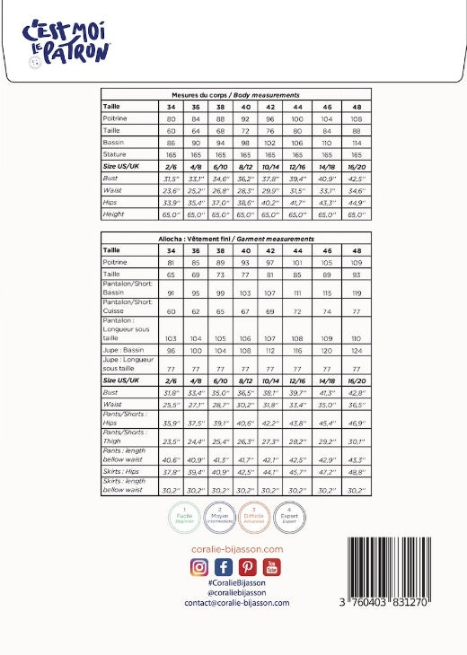 Available in sizes FR 34–48 (US 2–16, UK 6–20), the pattern includes detailed instructions with diagrams for each step. Tutorials for assembling the different versions are available on Coralie Bijasson's YouTube channel.