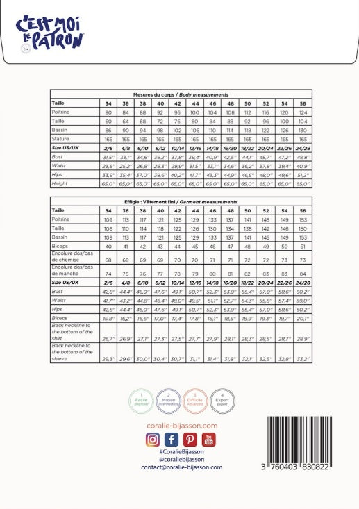Designed for sizes FR 34–56 (US 2–24, UK 6–28), this pattern is suitable for various body types. The loose fit makes it ideal for layering, allowing it to be worn as a classic shirt or an overshirt. A detailed tutorial is available on Coralie Bijasson's YouTube channel to guide you through the sewing process.