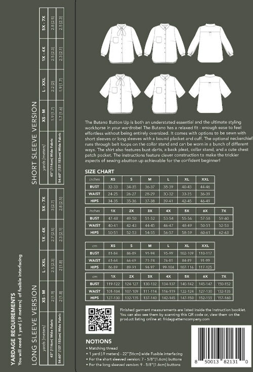 The Butano Button Up is both an understated essential and the ultimate styling workhorse in your wardrobe The Butano has a relaxed fit with enough ease to feel effortless without being entirely oversized. It comes with options to be sewn with short sleeves or long sleeves with a bound placket and cuff.