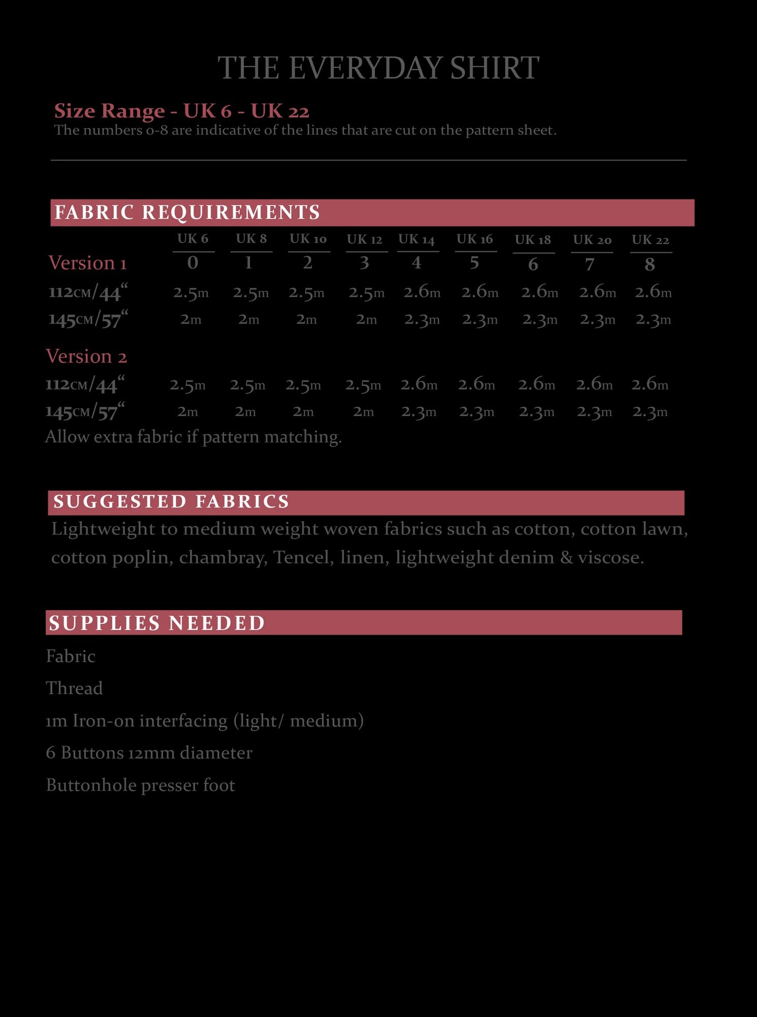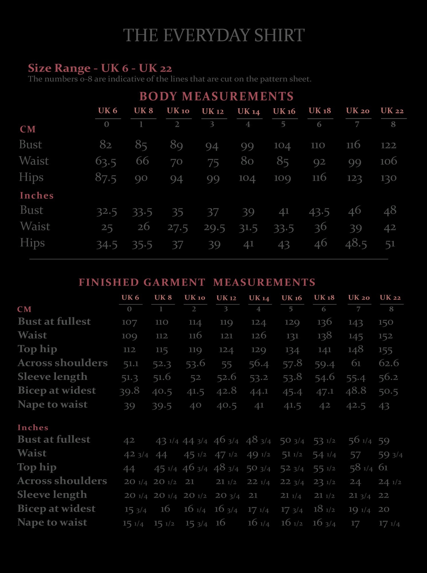 Pattern sizes - UK 6 - UK 22